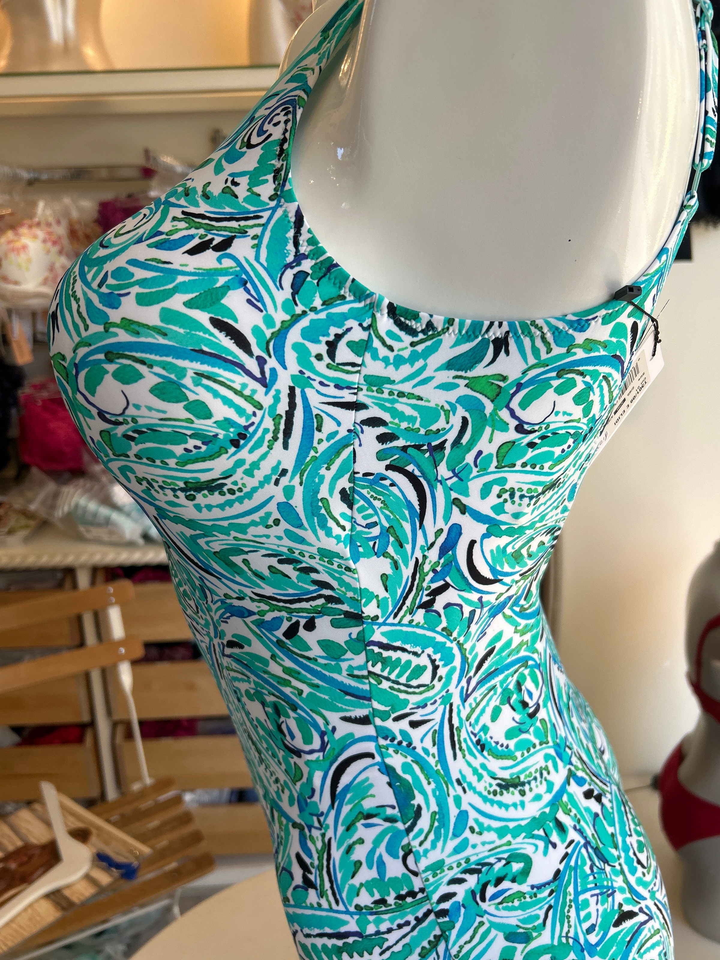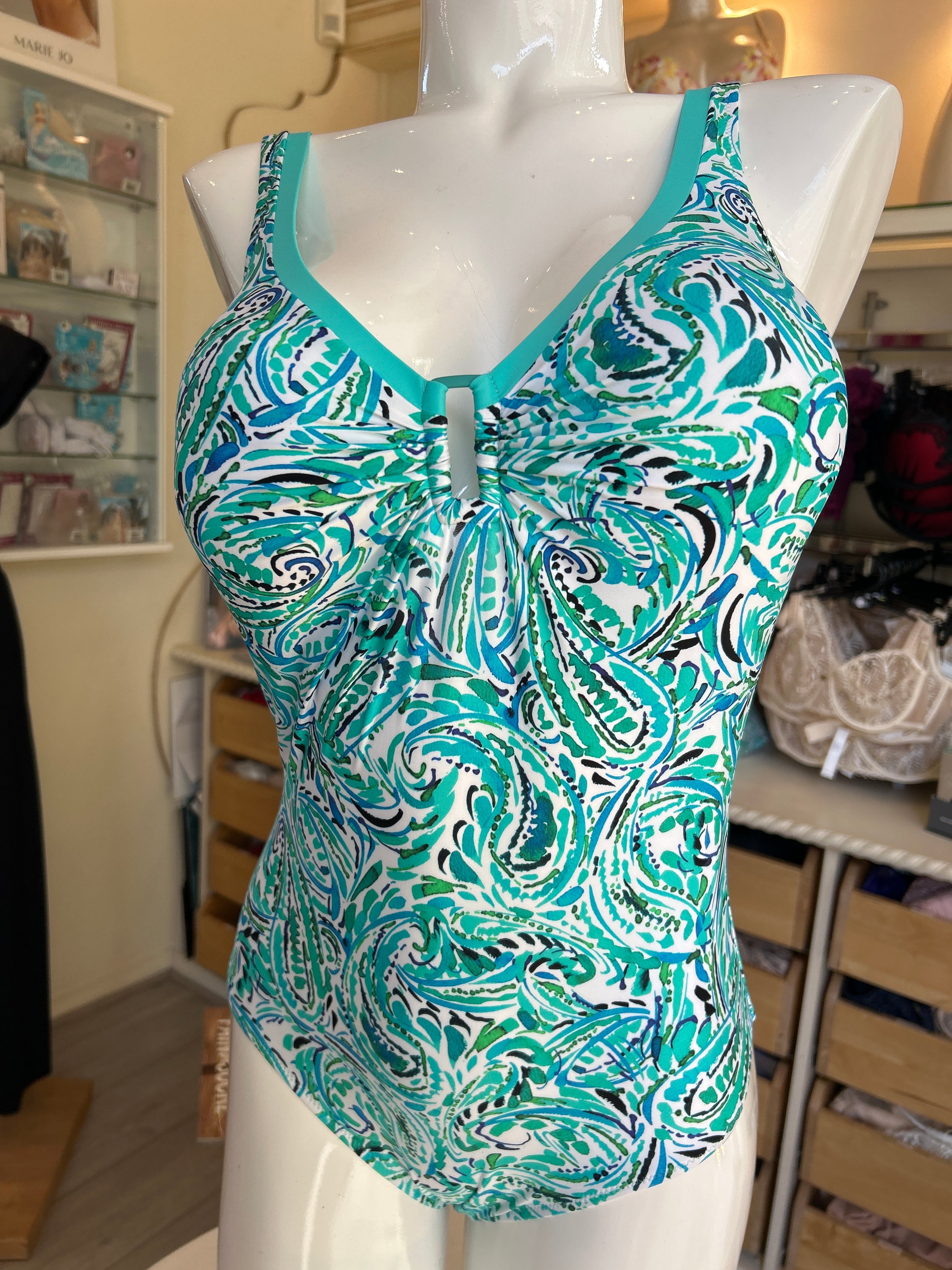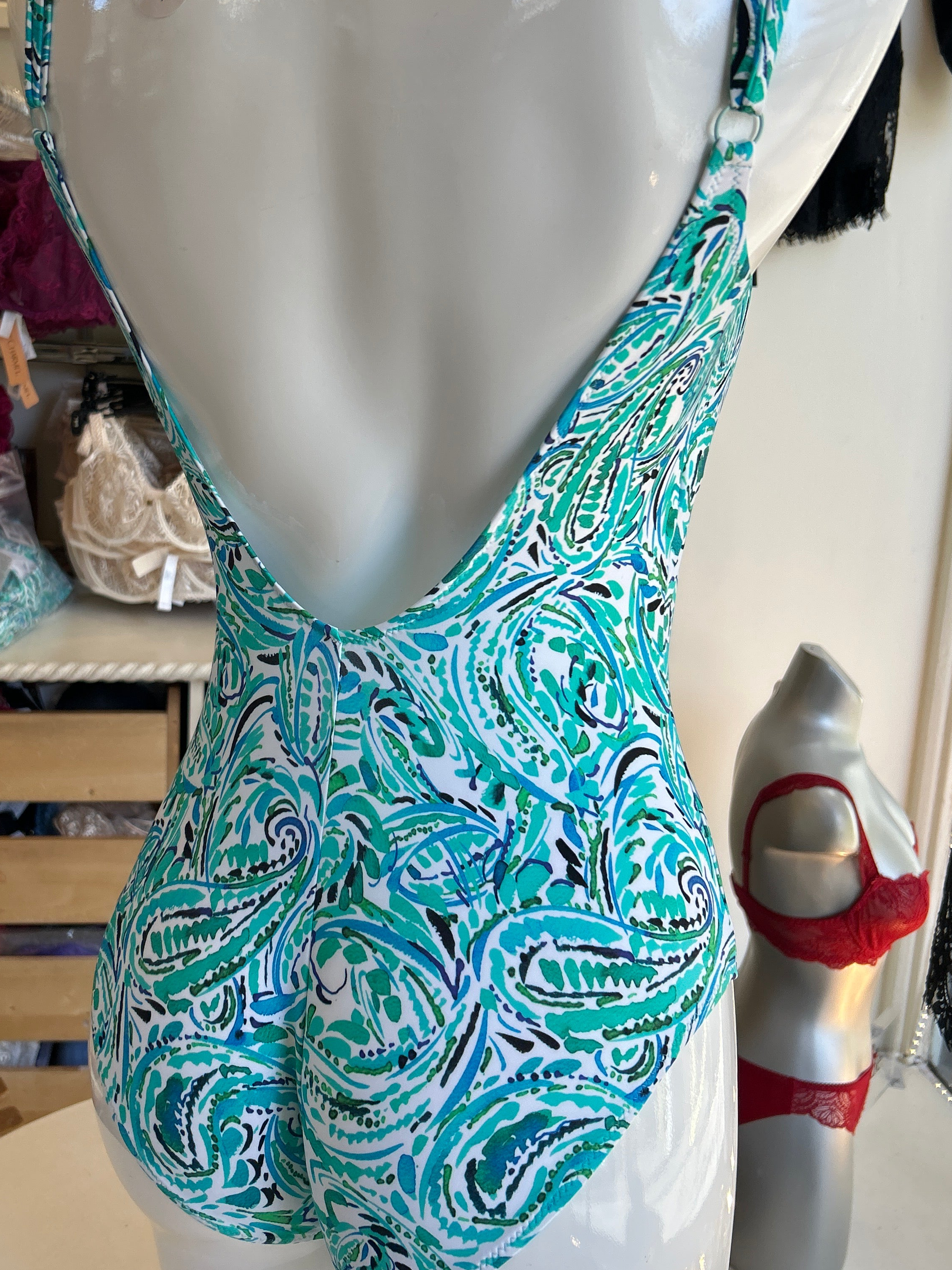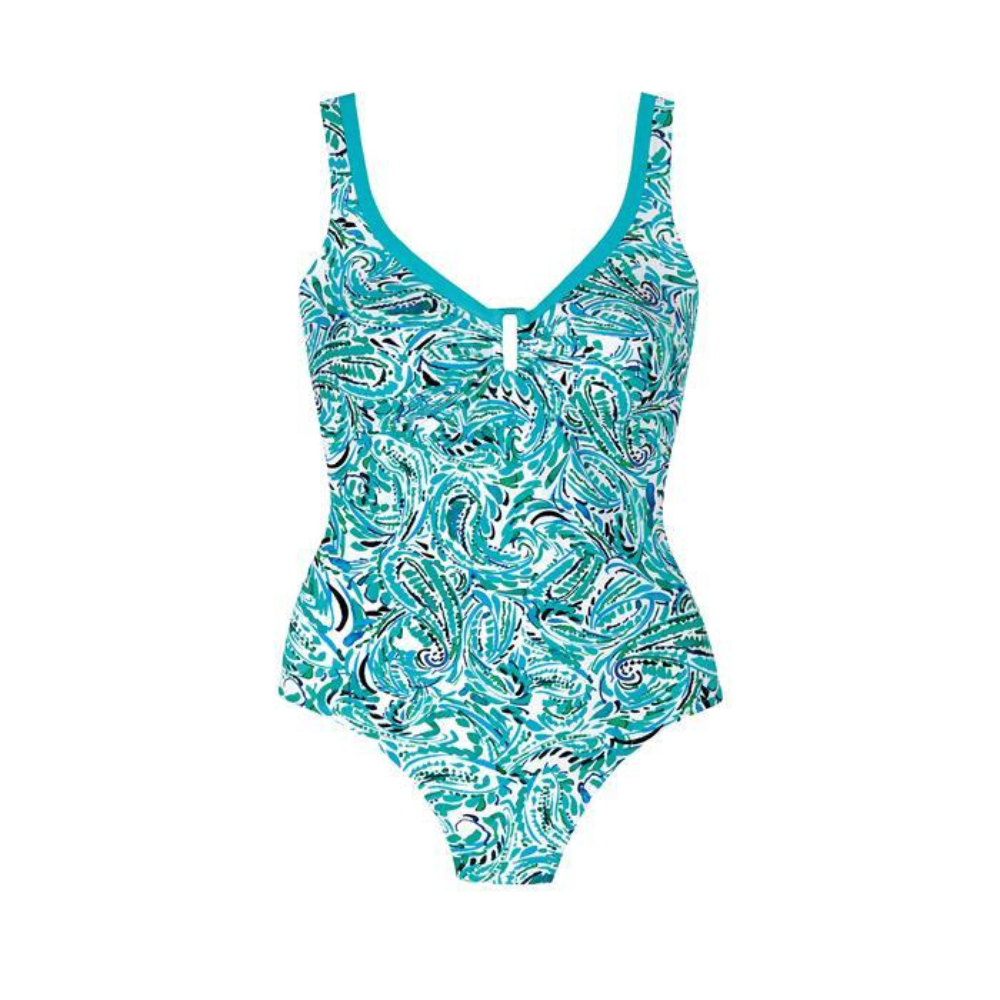 This effortlessly stylish 'Elidi' Swimsuit in Aqua Colours from the Milos collection by Tessy has a delightful painted print design and features a scoop neckline edged in turquoise with a ruched peekaboo buckle detail on the cleavage. The back is low and scooped.