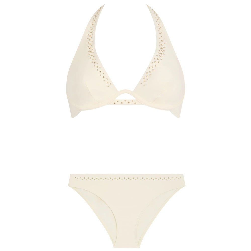 Crafted by luxury Paris fashion brand Aubade, this Halterneck Bikini Set in Opal from the Summer Stars collection showcases an elegant black design enhanced by a double row of gleaming golden studs.