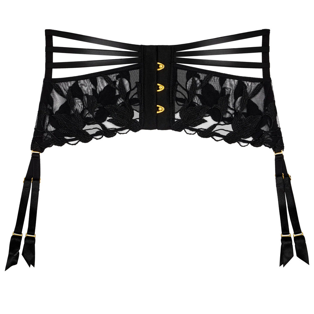 Aubade's 'Night at Paradise' Waistcincher in Obsidian (black) is designed to enhance your shape whilst holding up suspenders, and features florally embroidered sheer tulle triple straps that run front to back. A golden metallic enables you to pull in your waistline with ease. A sexy and beautiful work of lingerie art.