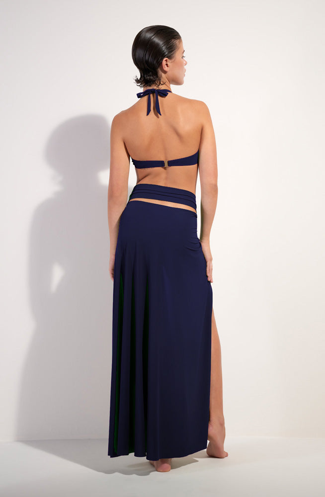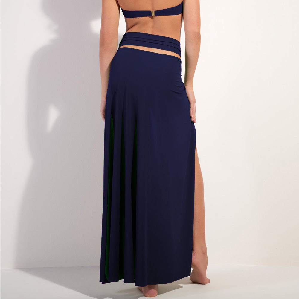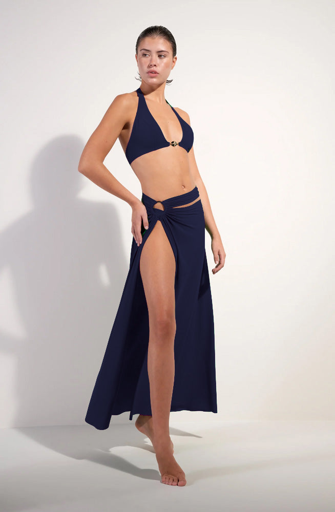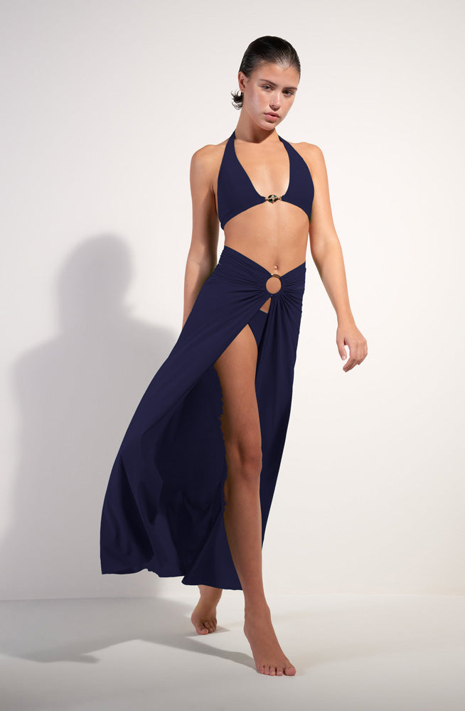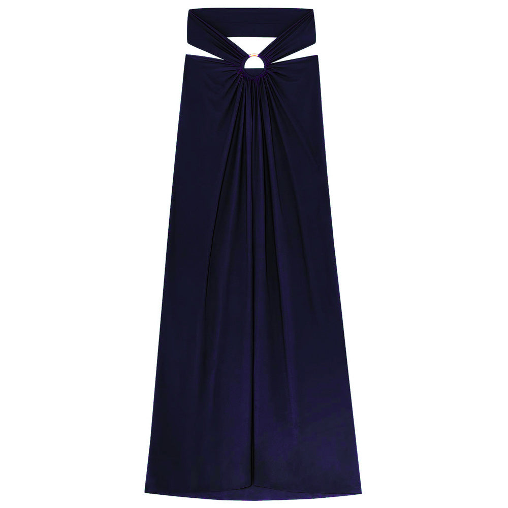 The 'Petra' Multi-Position Pareo Skirt in Navy by French luxury design house Pain de Sucre can be worn as a skirt or beach dress thanks to its versatile strap, which is secured by a large silver hoop. With its gathered, light stretch voile it's the perfect cover-up for the beach and pool, and stylish enough for the resort bar.