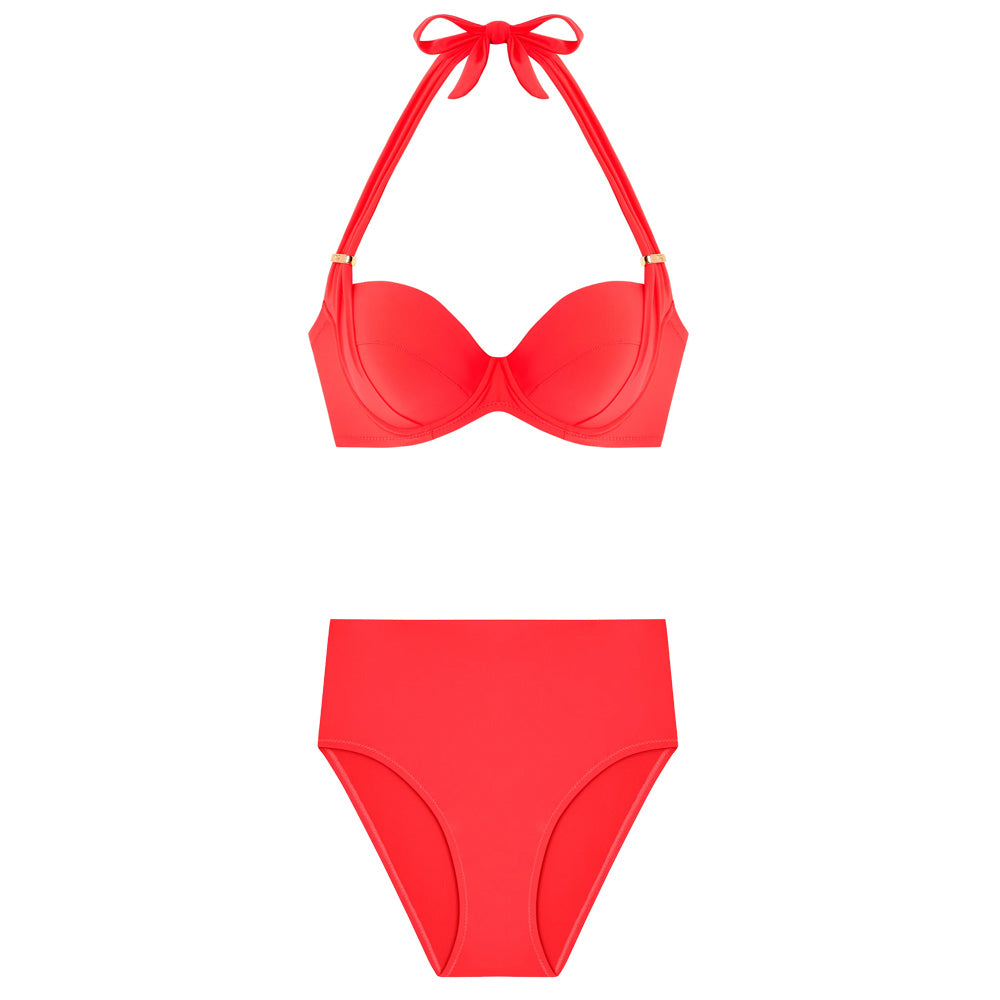 This fabulously versatile 'Lisia and Tobago' Halterneck Foldover Bikini Set in Groseille (red currant) by French luxury design house Pain de Sucre features a 'Lisia' top that can be worn halterneck-style, over the shoulders or bandeau-style. The cups are underwired and padded for comfort, whilst the 'Tobago' high-waisted brief can fold down for a lower-waisted look. A truly adaptable piece of swimear for your next adventure.