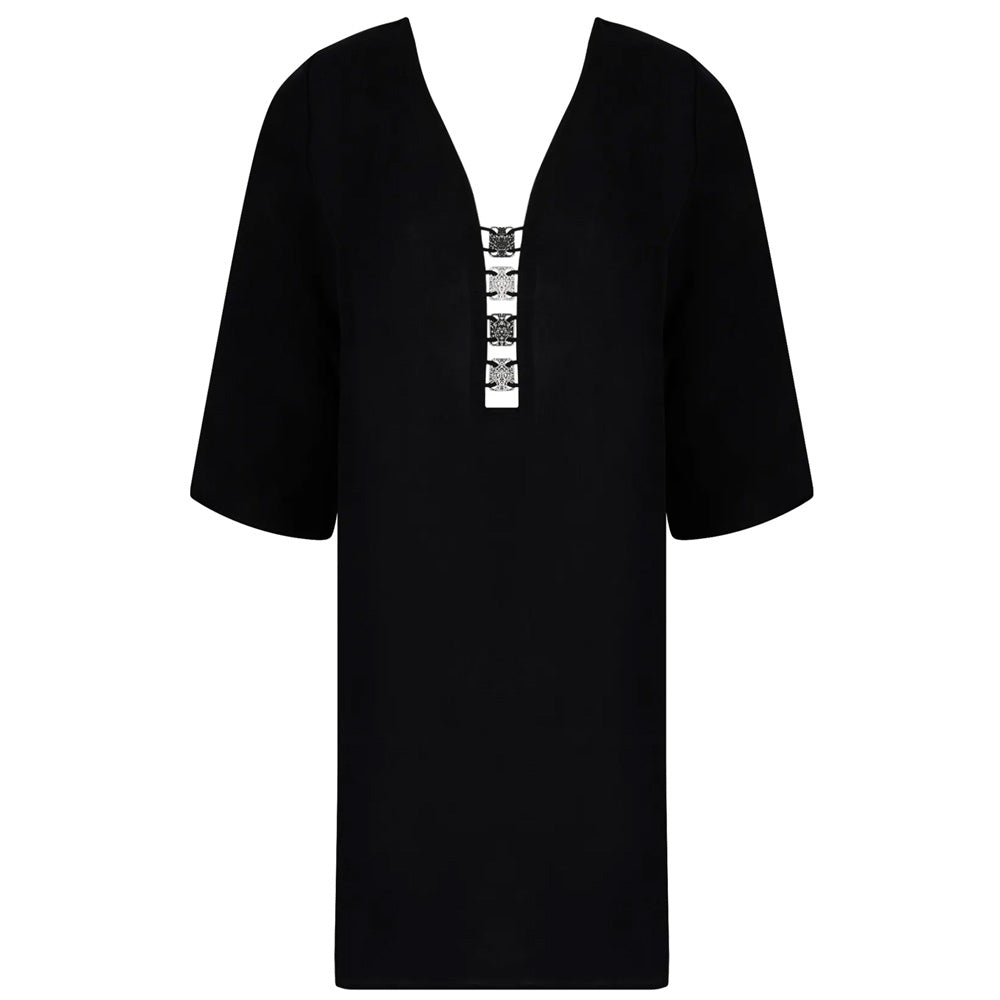 This lovely 'Eclat D’Argent' Beach Tunic in Black by French luxury brand Lise Charmel is made of a linen mix blend and features three-quarter length sleeves and a deep neckline with four plackets with silver hardware tags covering the cleavage. A must-have piece for a luxury beachwear collection.