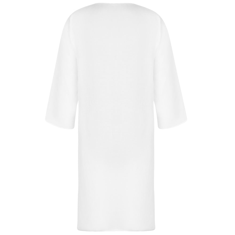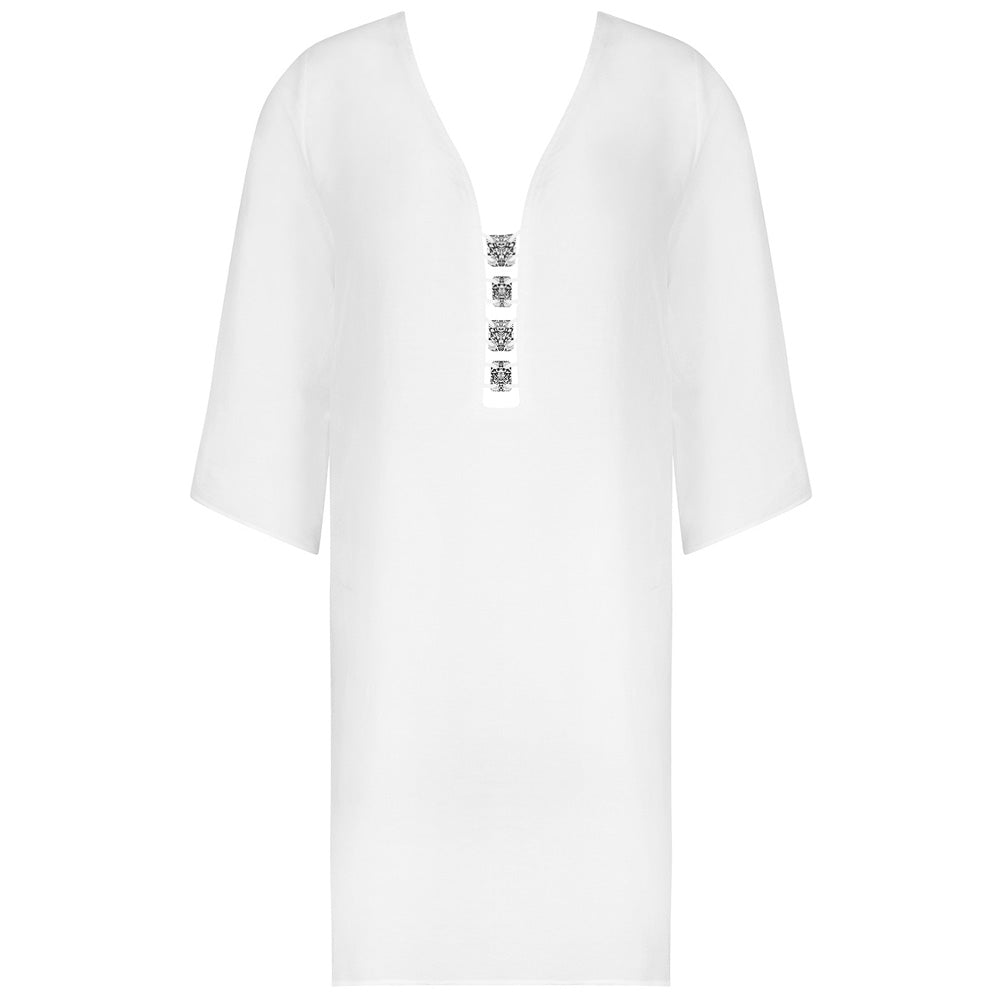 This lovely 'Eclat D’Argent' Beach Tunic in White by French luxury brand Lise Charmel is made of a linen mix blend and features three-quarter length sleeves and a deep neckline with four plackets with silver hardware tags covering the cleavage. A must-have piece for a luxury beachwear collection.