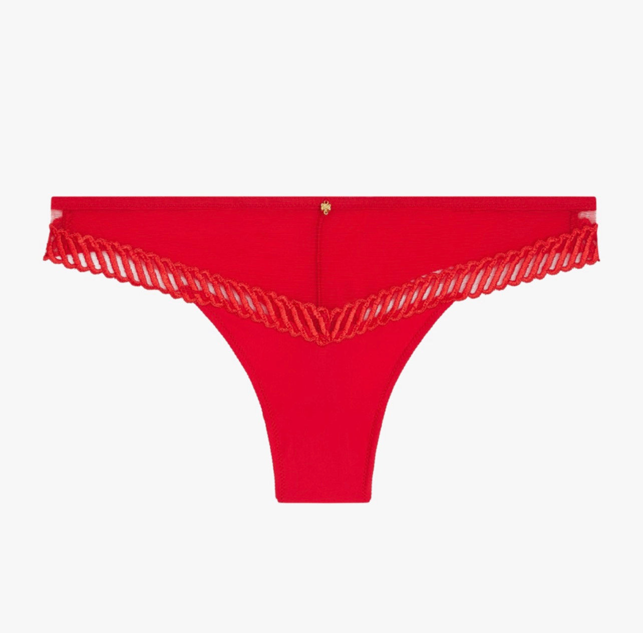 Aubade's 'Sheer Emotion' Tanga in Red features a provocative sheer tulle panel at the front, enhanced by modern, striking braid-style embroidery and a shimmering gold charm at the waist.