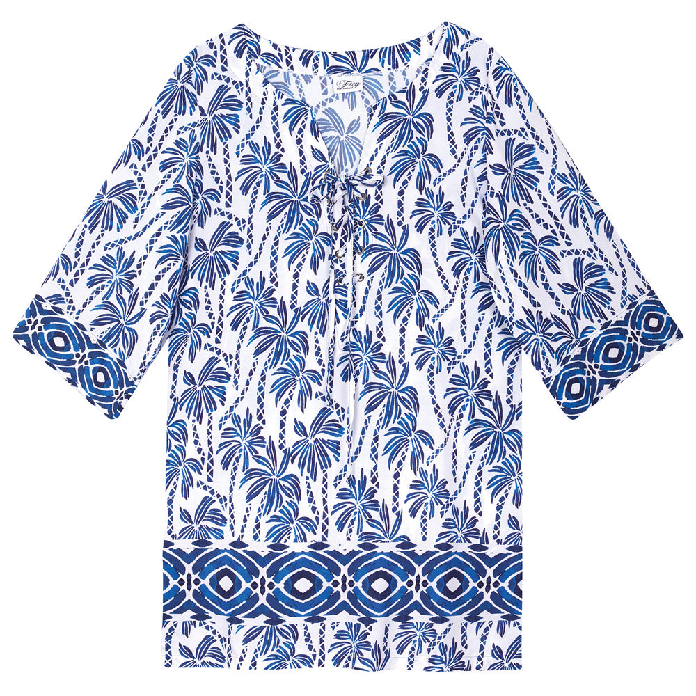 Transform your poolside impact with Tessy's exquisite 'Nala' Kaftan in Navy Blue on White from their sought-after 'Barth' assortment. Featuring a sophisticated geometric palm print, airy sleeves, and a lace-up V-neck, this cool kaftan exudes cool relaxation.